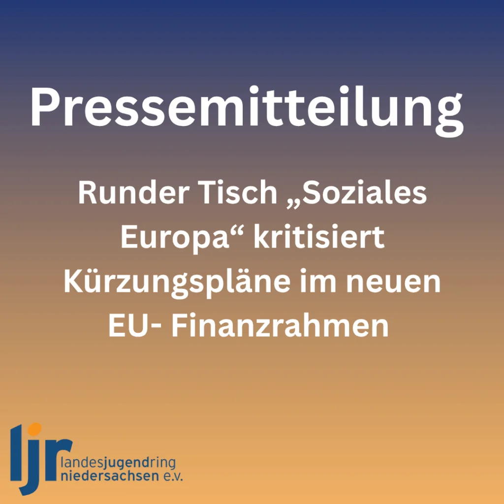 Auf seinem diesjährigen Spitzentreffen hat der Runde Tisch „Soziales Europa“ eine kritische Bewertung aus niedersächsischer Perspektive zu den aktuellen Vorschlägen der Europäischen Kommission zum Mehrjährigen EU-Finanzrahmen (MFR) 2028-2034 vorgenommen. In einem gemeinsamen Statement warnen Europaministerin Melanie Walter, der Vorsitzende des DGB Niedersachsen Dr. Mehrdad Payandeh, die Vorsitzende der LAG der Freien Wohlfahrtspflege Kerstin Tack und […] Pressemitteilung: Jugendpolitische Leerstelle bleibt bestehen – Haushaltsklausur 2025 ohne neue Impulse für junge Menschen