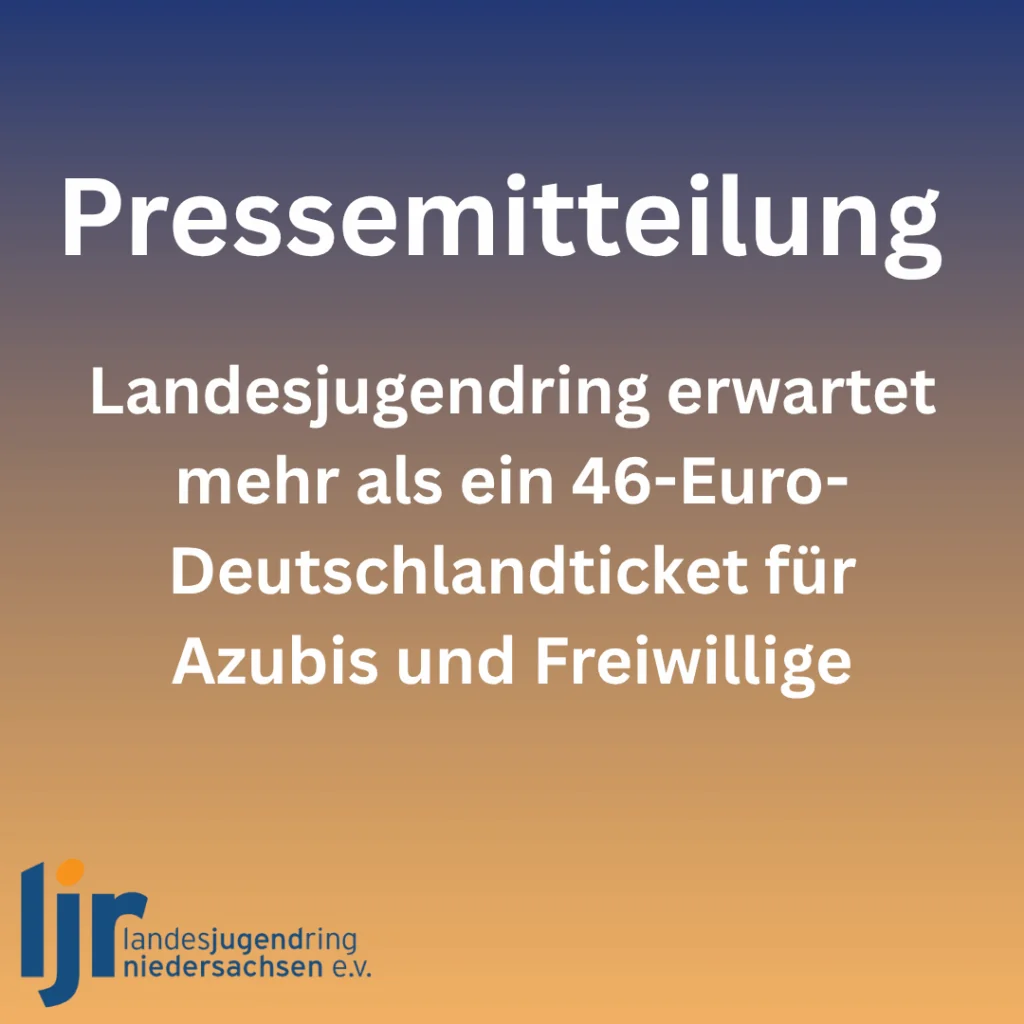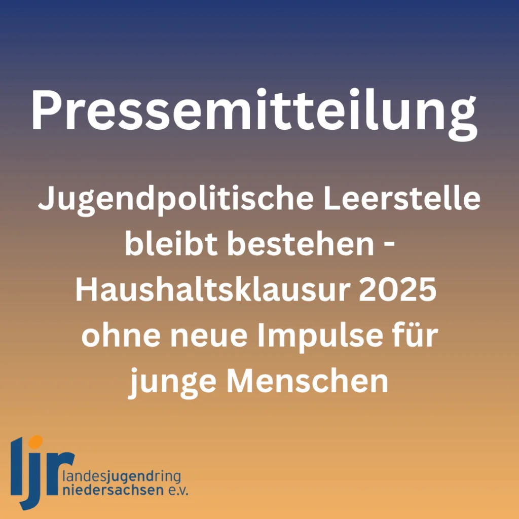 Trotz der beschlossenen milliardenschweren Investitionen im Rahmen der Haushaltsklausur 2025 bleibt die niedersächsische Landesregierung zentrale jugendpolitische Impulse schuldig. Die vorgestellten Maßnahmen konzentrieren sich erneut nahezu ausschließlich auf schulische Bildung, wirtschaftliche Entwicklung und infrastrukturelle Themen. Die nachhaltige Finanzierung jugendpolitischer Themen sucht man vergeblich.Mit dem Ausbau des ÖPNV im ländlichen Raum und den 200 Millionen Euro für […] Pressemitteilung: Landesjugendring erwartet mehr als ein 46-Euro-Deutschlandticket für Azubis und Freiwillige