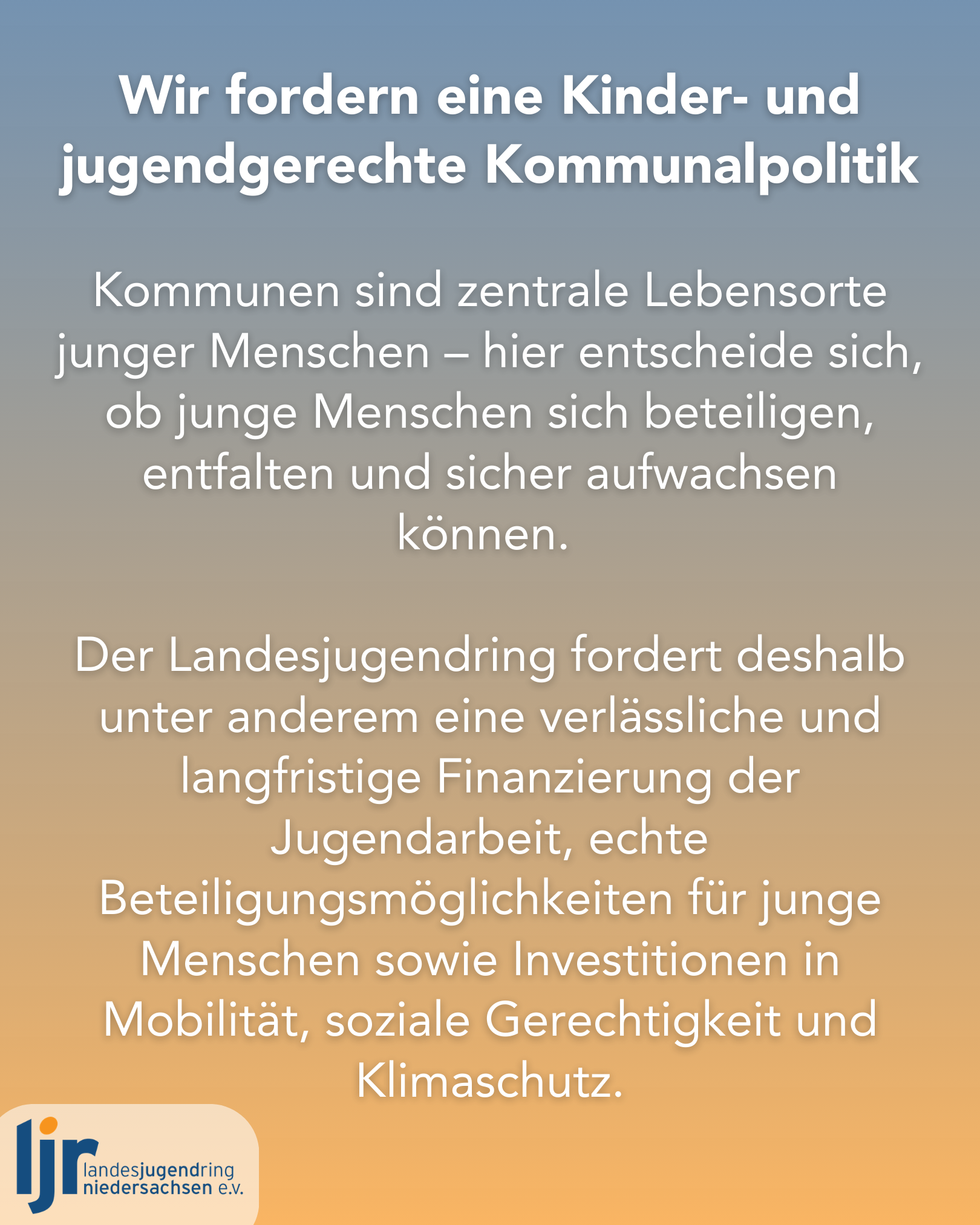 Mit den verabschiedeten jugendpolitischen Forderungen fordert der Landesjugendring eine kinder- und jugendgerechte Kommunalpolitik. Kommunen seien zentrale Lebensorte junger Menschen – hier entscheide sich, ob junge Menschen sich beteiligen, entfalten und sicher aufwachsen können. Der Landesjugendring fordert deshalb unter anderem eine verlässliche und langfristige Finanzierung der Jugendarbeit, echte Beteiligungsmöglichkeiten für junge Menschen sowie Investitionen in Mobilität, soziale Gerechtigkeit und Klimaschutz. „Jugendarbeit muss als unverzichtbare Infrastruktur verstanden und verbindlich sowie auskömmlich gefördert werden“, bekräftigt Nils Lüking, der als Vorstandssprecher im Amt bestätigt wurde.