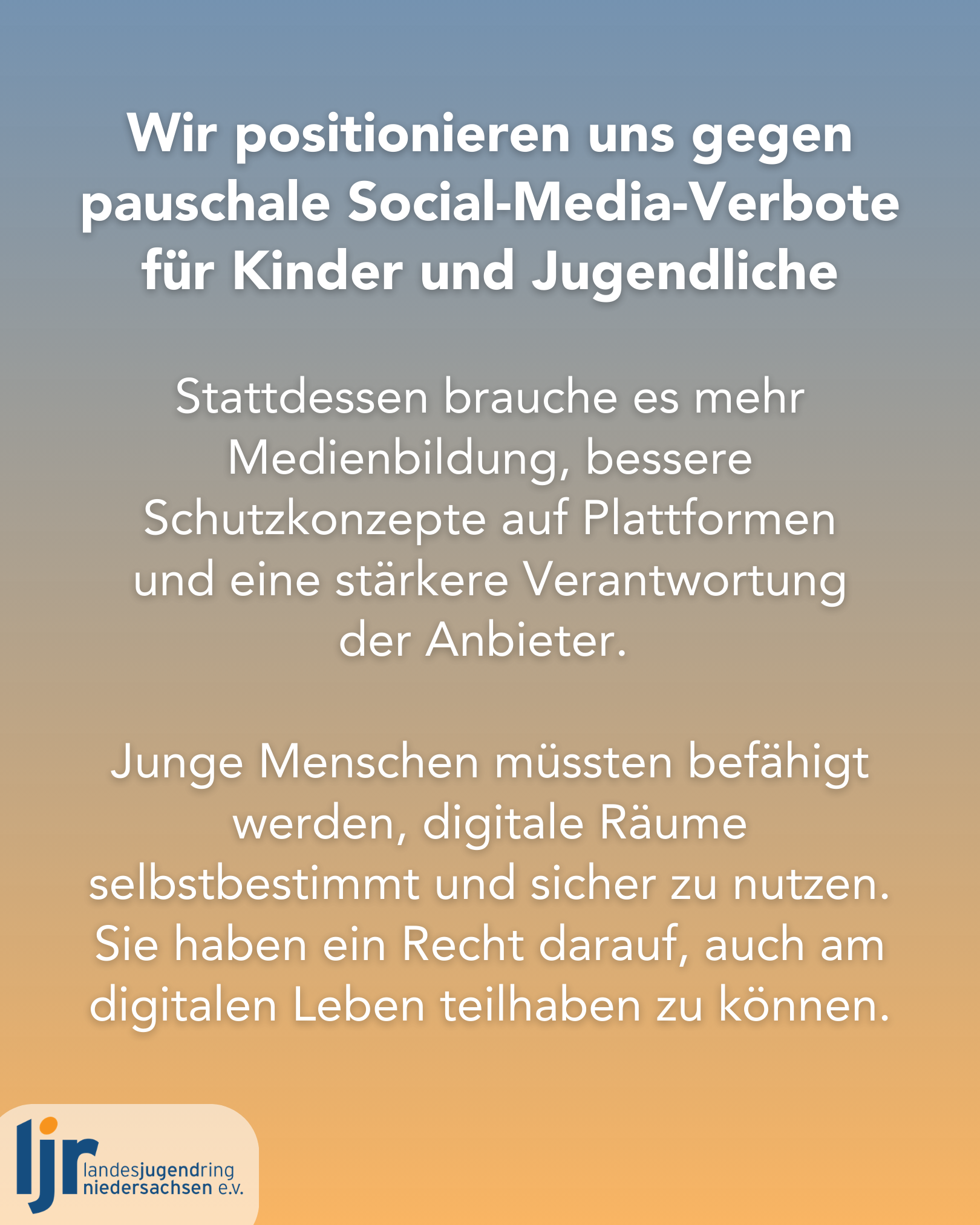 Verbote für Kinder und Jugendliche. Solche Verbote greifen aus Sicht des Landesjugendrings zu kurz und verkennen die Lebensrealität junger Menschen. Stattdessen brauche es mehr Medienbildung, bessere Schutzkonzepte auf Plattformen und eine stärkere Verantwortung der Anbieter. Junge Menschen müssten befähigt werden, digitale Räume selbstbestimmt und sicher zu nutzen. Sie haben ein Recht darauf, auch am digitalen Leben teilhaben zu können.