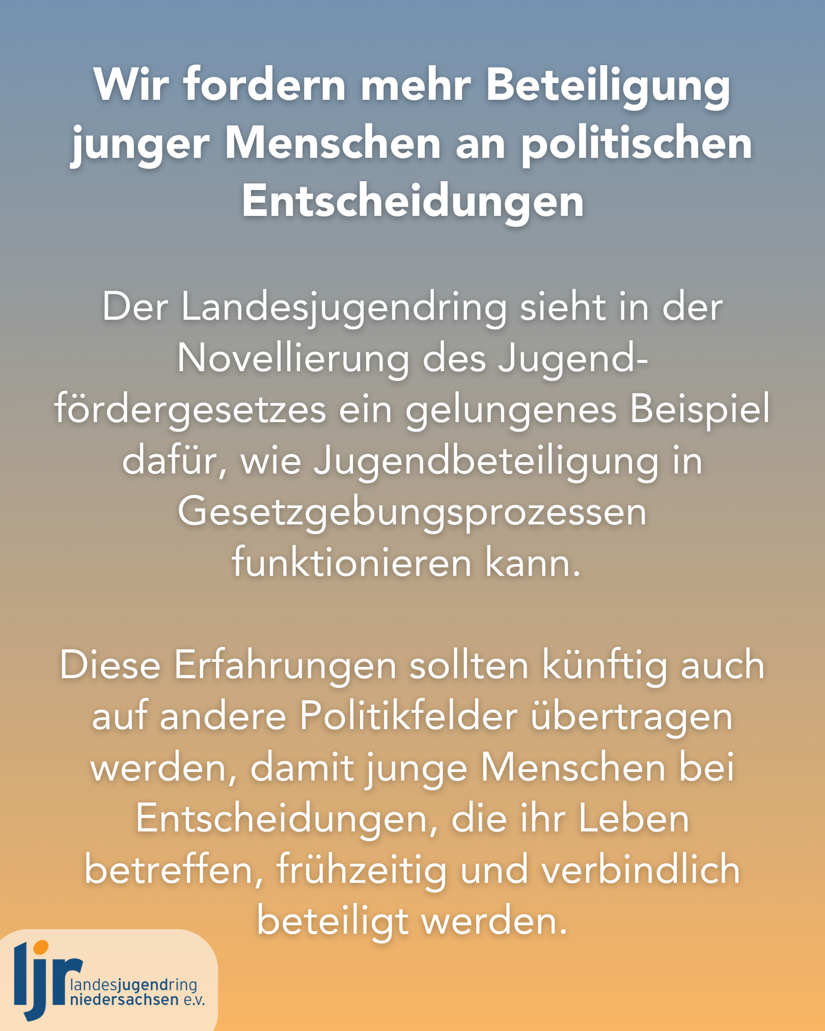 Der Landesjugendring Niedersachsen e.V. ist der Zusammenschluss der 19 landesweit organisierten niedersächsischen Jugendverbände. Er vertritt die Interessen von ca. 80 einzelnen Jugendverbänden und etwa 200 kommunalen Jugendringen sowie die Interessen der jungen Menschen in Niedersachsen. Ferner unterstützt der LJR das ehrenamtliche Engagement von 50.000 Jugendleiter*innen in der Kinder- und Jugendarbeit in Niedersachsen.